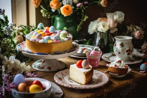 Happy Easter background, Easter eggs scene, Easter bunny ears with easter eggs, Easter poster background template with Easter eggs in the nest, Easter party concept.