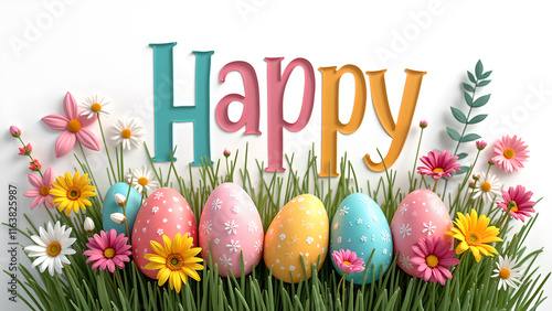 Happy Easter greeting with colorful eggs and flowers. Concept of spring, celebration, and joy.