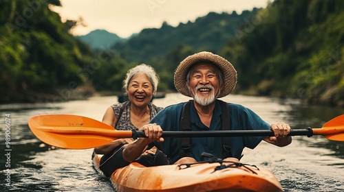 happy elderly couple kayaking together