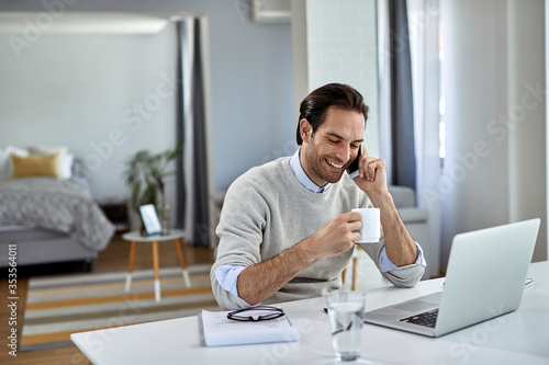 Happy entrepreneur talking on the phone while working at home.