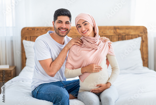 Happy expecting arab couple cuddling while spending time together at home, free space