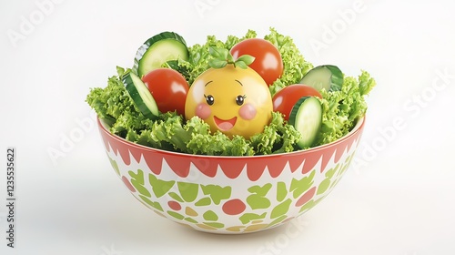 Happy face cheese ball in a fresh vegetable salad.