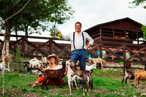 happy family, a man and a woman in a hat, relaxing and laughing on a farm, surrounded by goats, on a sunny day