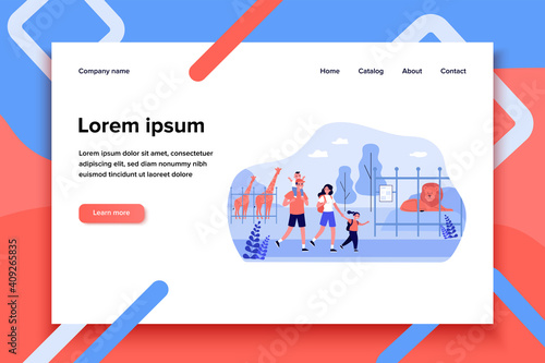 Happy family couple with excited kids walking in zoo. Parents and little children going past cages and enclosures with lion and giraffes. For African animals, safari, tourists concept
