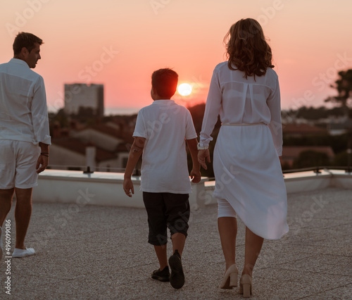 Happy family enjoys and spends time together on the roof of the house. Selective focus