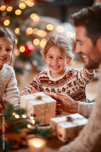 Happy family exchanging christmas gifts near decorated tree