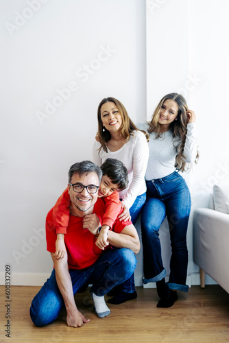 Happy family having fun near wall at home