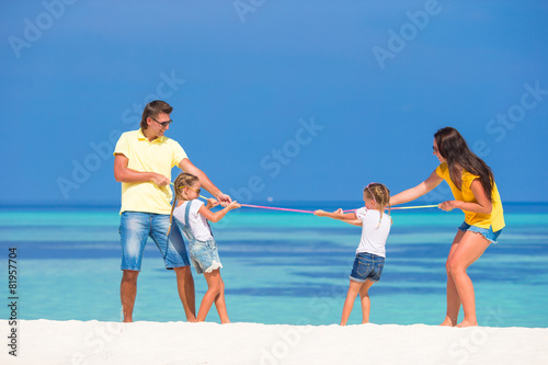 Happy family having fun on white beach