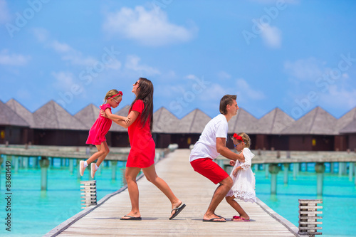 Happy family of four during summer vacation at luxury resort
