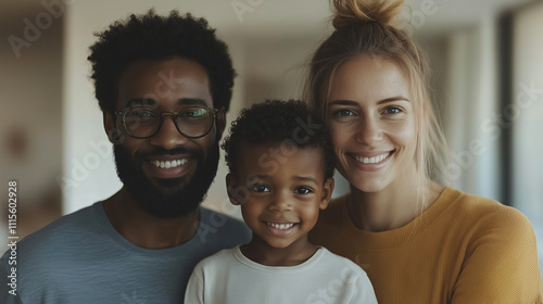 Happy family poses together in bright indoor setting, capturing joyful moment with smiles and love for each other. Generative AI
