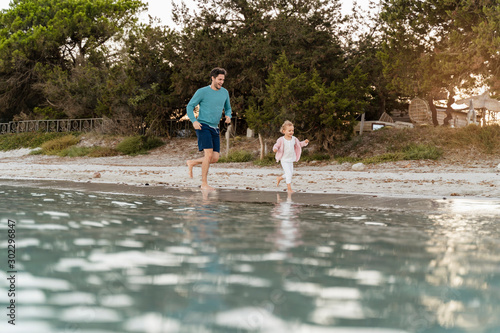 Happy father running with daughter on the seashore