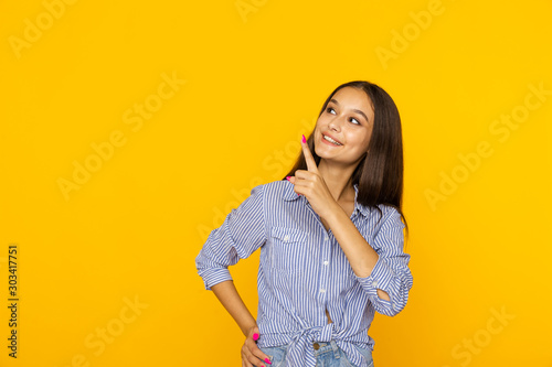 Happy female model is on the yellow studio pointing something by finger isolated