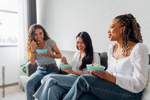 Happy friends eating salad sitting on sofa at home