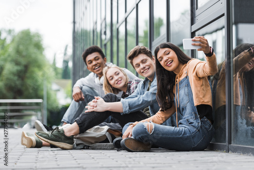 Happy friends smiling, sitting and taking selfie with smartphone