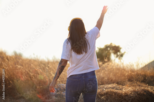 Happy girl staring at the sky with the music in her ears and the sun bronzing her skin