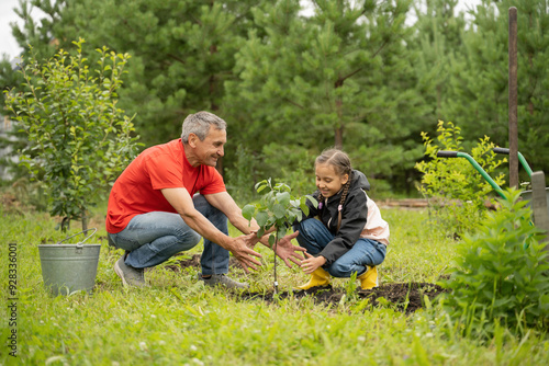 Happy grandfather and grandchild admiring planted apple tree in garden