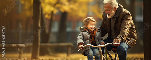 Happy grandfather teach cycling a child in park, wide banner