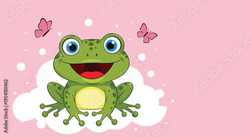 Happy green frog sitting on a white cloud surrounded by pink butterflies and white dots on a pink background scene.