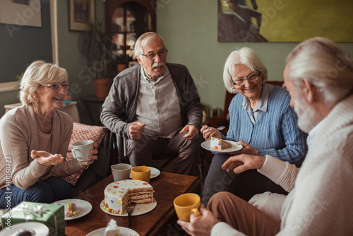 Happy group of senior friends enjoying coffee and cake together at home