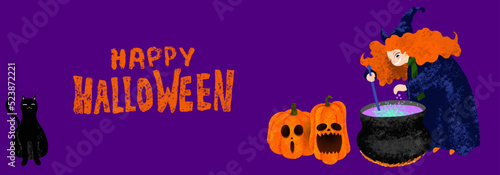 Happy Halloween banner template with witch cooking the potion in the cauldron. Hand drawn vector illustration with pumpkins and black cat on purple background. Chalk Lettering with grunge effect