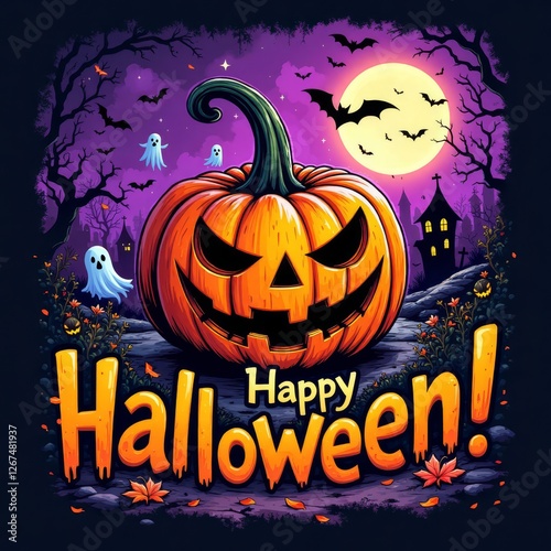 Happy Halloween Cartoon with Ghosts and Bats in Night Sky