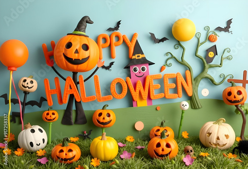 Happy Halloween, dressed up kids , ghosts, whitch background mockups and decoration spooky horror graveyard design