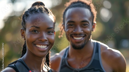 Happy, healthy, and fit fitness couple running and cardio training outdoors. Sporty Asian man and black woman eager to workout in nature.