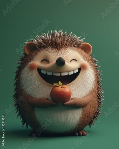 Happy hedgehog holding an apple. AI.