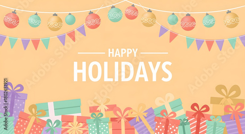 Happy Holidays Greeting Card or Banner with String Lights Ornaments Bunting Garland and Pile of Patterned Gift Boxes Vector Illustration