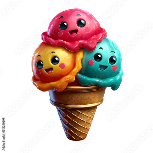 Happy ice cream cone with three pastel scoops and blushing cheeks, transparent background