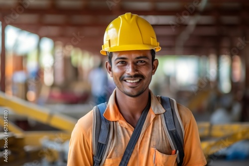 Happy indian man in an engineer hard hat at a construction site. Work process, construction of a house