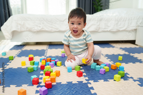 happy infant baby playing wooden block toy on jigsaw mat in bedroom