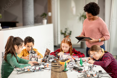 Happy kids with their African American female science teacher with laptop programming electric toys and robots at robotics classroom