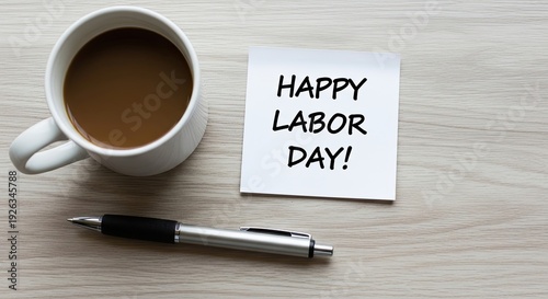 Happy labor day celebration with coffee and note