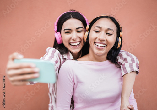 Happy latin women taking a selfie with mobile phone - Millennial generation girls streaming a video online