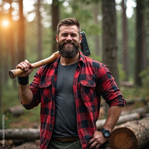Happy lumberjack man with beard holds axe over shoulder in forest. Strong woodcutter worker with tool, power equipment in rural nature setting. Lumberjack smiles with expression of confidence,
