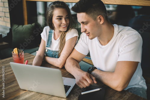 Happy male and female feeling good from spending time togetherness at street cafeteria for online shopping in web stores, positive couple in love watching funny movie via modern laptop computer