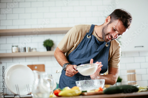 Happy man baking in the kitchen. Man making fresh pasta at home