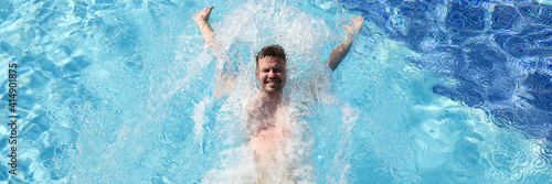 Happy man in yellow swimming trunks float on back in blue clear and transparent water. Splashes and waves from water fly in different directions.