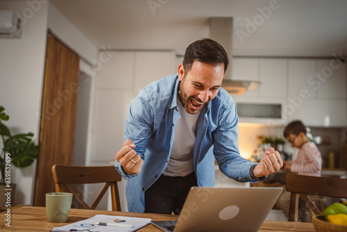 Happy man read good news on laptop with his son at background