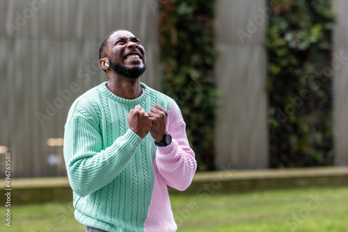 Happy man wearing wireless in-ear headphones gesturing fists