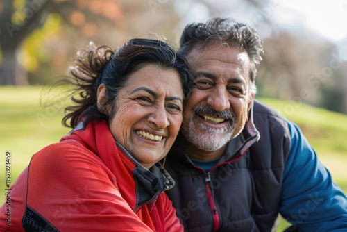 Happy mature fitness couple resting after run in park.