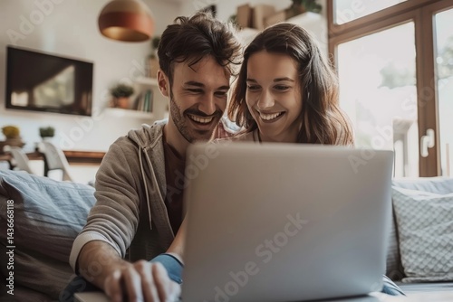 Happy mature mid age couple using laptop sit on sofa doing ecommerce shopping online on website. Smiling senior old adult man and woman looking at computer buying insurance browsing internet at home.