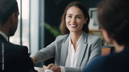 Happy mid aged business woman manager handshaking at office meeting. Smiling female hr hiring recruit at job interview, bank or insurance agent, lawyer making contract deal with client at work