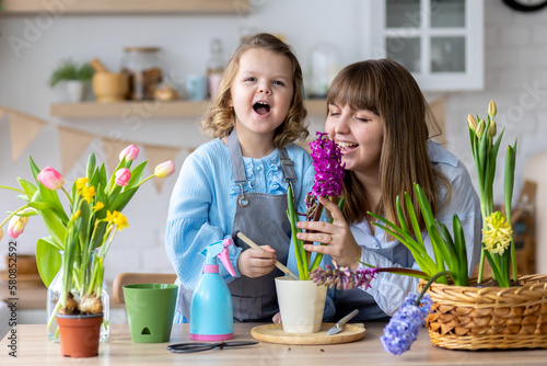 Happy mother and daughter doing home gardening together in the kitchen, taking care about flowers, plants. Family traditions and quality time, having fun, enjoy domestic life. Mother's or Women's day