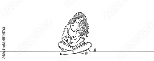 Happy Mother day card. Continuous one line drawing. Woman hold her baby. Vector illustration