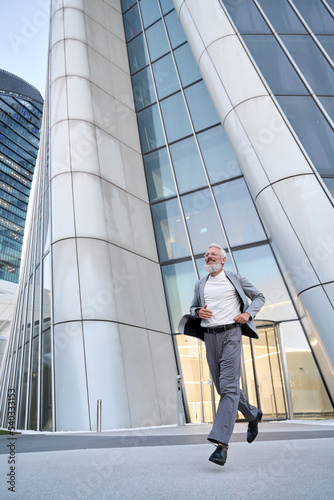 Happy motivated stylish older senior professional business man wears suit running in big city street business office downtown financial district glass buildings feeling freedom hurrying after work.
