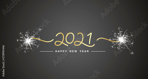 Happy New Year 2021 handwritten lettering tipography gold numbers sparkle firework black background banner