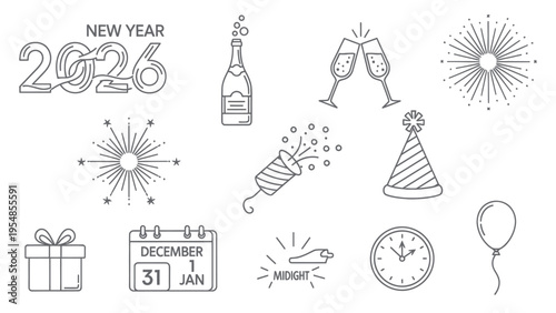 Happy New Year 2026 Celebration Icons: Countdown, Champagne, Fireworks, Gifts