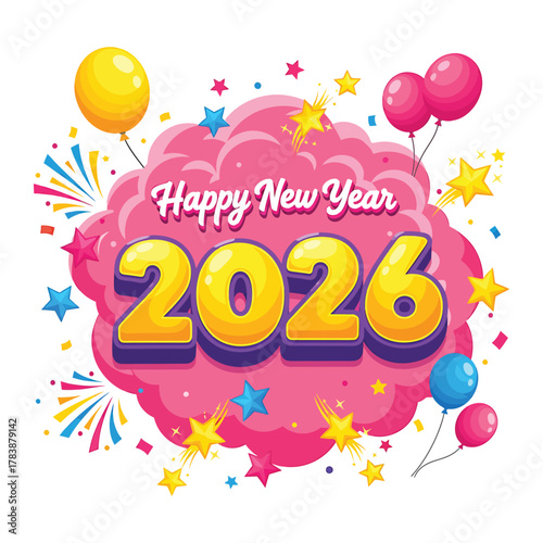 Happy new year 2026 celebration with balloons and stars